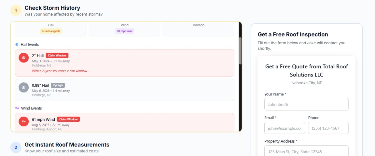 Homeowner enters their address. Instantly sees every storm that hit their property — hail size, wind speed, date, time.